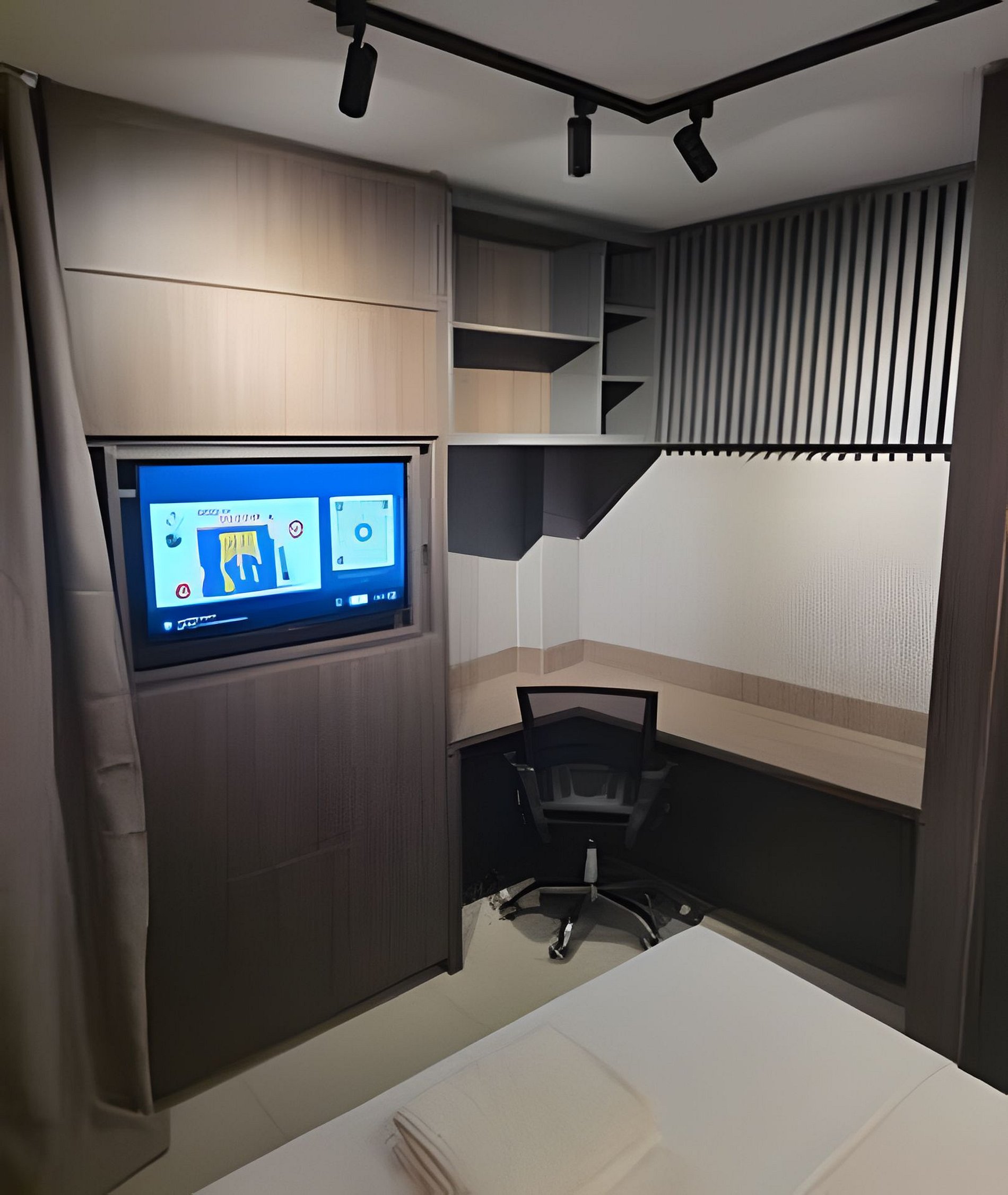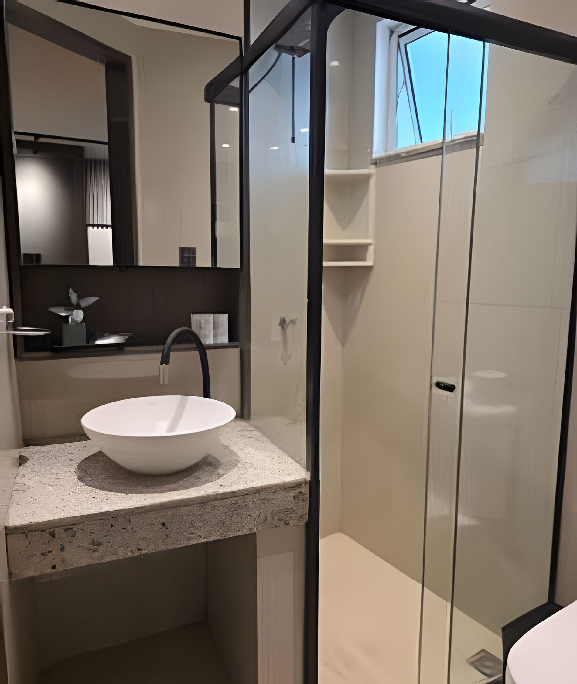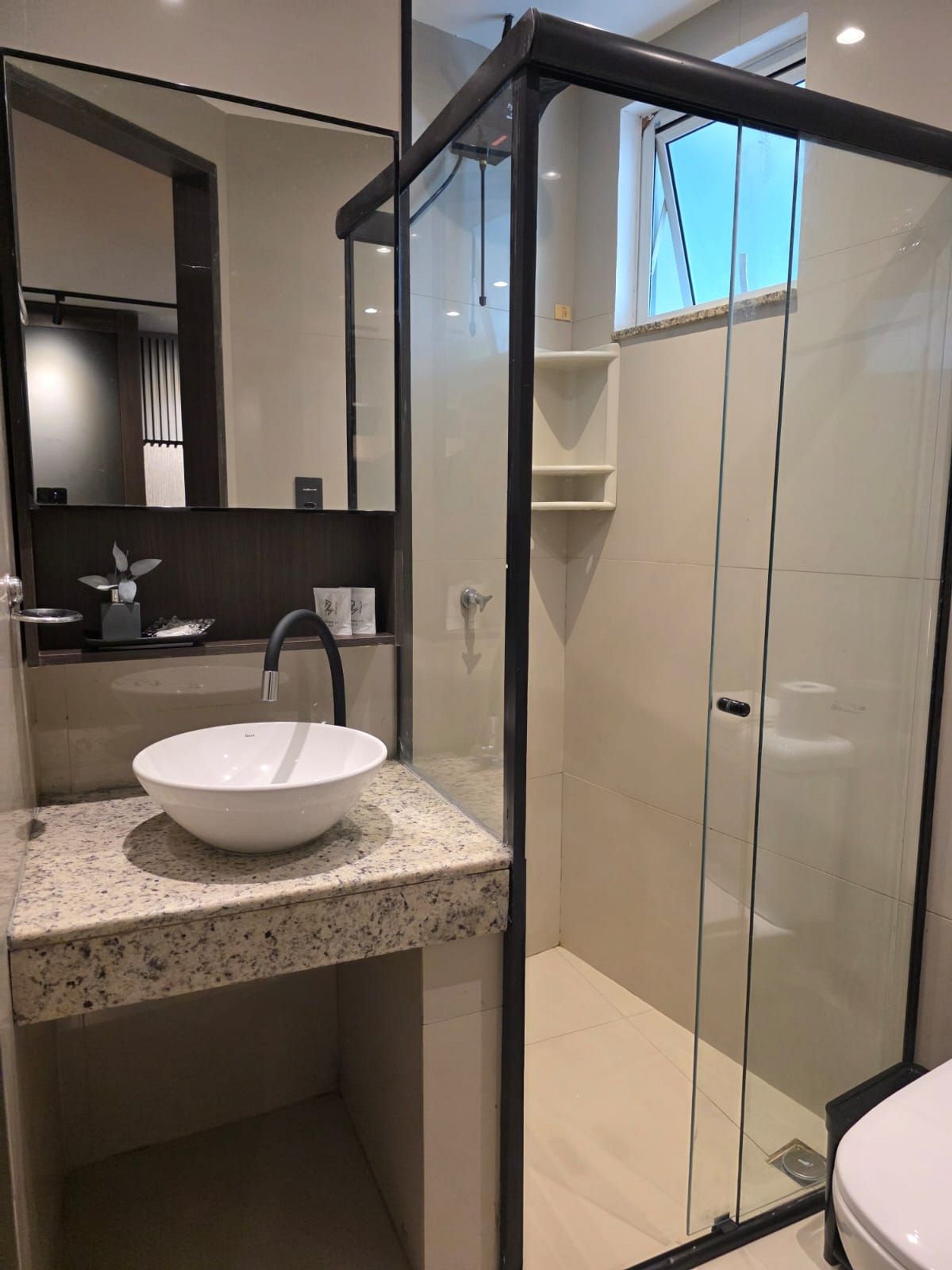 Apto todo decorado e pensado para uma estadia confortável e funcional. Prédio exclusivo de flats para hospedagem, garagem, mini mercado, lavanderia. O apartamento vem com cama de casal confortável, tv smart de 32" Mesa com cadeira de escritório, mesa de refeições com 2 cadeiras, banheiro completo com chuveiro quente. Varanda gourmet com fogão de indução, panelas próprias, utensílios para cozinhar, filtro, micro-ondas e frigobar